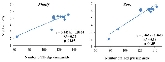 Relation between number of filled grains panicle−1 and yield of Kharif and Boro rice.