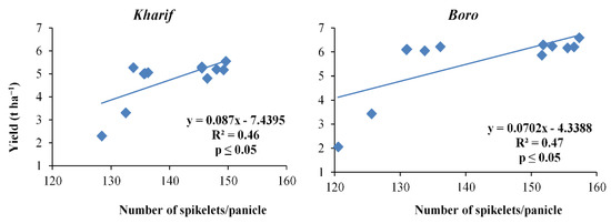 Relation between number of spikelets panicle−1 and yield of Kharif and Boro rice.