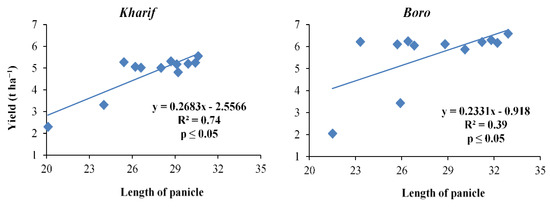 Relation between length of panicle and yield of Kharif and Boro rice.