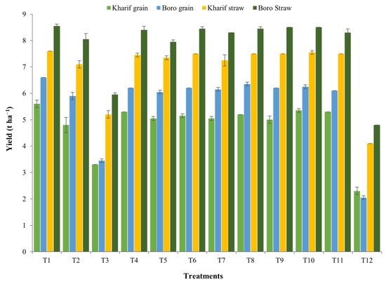 The ‘R’ values of the yield attributes were reflected in the productivity of the Kharif and Boro rice in terms of grain and straw yields during both the years of study (Figure 2, Figure 3, Figure 4, Figure 5, Figure 6 and Figure 7). The data showed that the grain yield of Kharif rice was at its maximum (5.46 and 5.67 t ha−1 in 2014 and 2015, respectively) with the treatment T1 (Figure 8). In 2014, the treatment with an ample dose of nutrients (T1) produced significantly more grain yield than T2, T3, and the control (T12); but, in 2015, T1 yielded significantly more than T3 and the control. The other treatments were statistically on par with T1. The grain yield of Boro rice was higher with the application of an ample dose of the recommended fertilizer (T1) that yielded 6.6 t ha−1 in both years. The treatments were statistically on par with the other treatments, except for T2, T3, and T12 (unfertilized control), in increasing the grain yield of Boro rice during both years. In the rice–rice cropping system also, both the Kharif and Boro rice yielded more with the ample dose of nutrients application. A similar type of impact of an ample dose of recommended nutrients was earlier noted by Mohapatra [38] and Trivedi et al. [39].