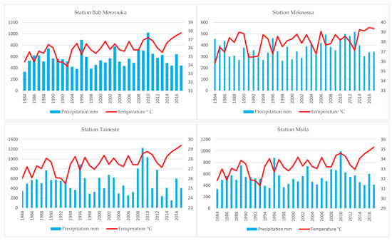 Monthly and annual average precipitation and temperature data are calculated over the period 1984 to 2017. Rainfall patterns throughout the basin are very similar: heavy rainfall in winter, relatively minimum in autumn and spring, and very light rainfall in summer. The average annual rainfall increases from 383 mm at Meknassa, to 575 mm at Taza, 577 mm at Bab Merzouka. The increase in rainfall downstream can be explained by the influence of the Middle Atlas (