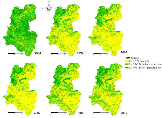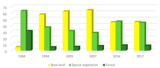 Figure 8), natural vegetation covered 94.3% of the study area before being decreased to 43.3% in 1994, and the forest covering 31% of the watershed was reduced to 5%. The sparse vegetation such as grasslands or senescent shrubs and shrubs covered 63.2% was reduced to 36.9%. The bare ground, which affected 5.7% at earlier times, reached 47.7% in 2017.