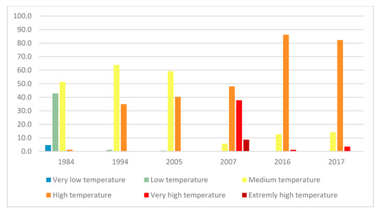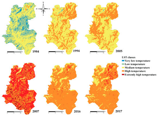 Between 1994 and 2007, the normal temperature area decreased continuously to 0.5% in 2005, while the medium and high-temperature areas were 59.2% and 40.3% of the total study area respectively.