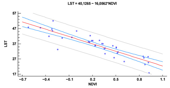 Statistical analysis indicates a strong relationship between Land Surface Temperature (LST) and vegetation index (NDVI). This can help us conclude that, over time, the temperature increases when and where the vegetation cover decreases, and vice versa.
