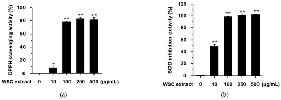 Figure 2. Antioxidant effects of WSC extract: (a) The DPPH scavenging activity of WSC extract was measured at the indicated concentrations; (b) The SOD inhibition activity of WSC extract was measured at the indicated concentrations. Values are expressed as the mean ± standard deviation of three independent experiments. *, p < 0.05; **, p < 0.005 versus the control.