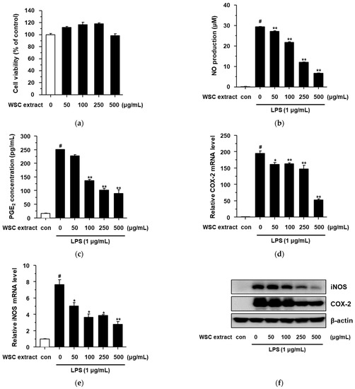 Figure 3. Anti-inflammatory effects of the WSC extract on LPS-stimulated RAW264.7 cells: (a) Cytotoxicity of the WSC extract was measured via dimethylthiazol-diphenyltetrazolium bromide assay; (b) Griess reaction assay was performed to determine NO production; (c) PGE2 concentration was determined using an ELISA kit; (d,e) iNOS and COX-2 mRNA levels were analyzed by quantitative real-time PCR; (f) iNOS and COX-2 protein levels were determined by western blotting assay. Values are expressed as the mean ± standard deviation of three independent experiments; #, p < 0.005 versus control; *, p < 0.05; **, p < 0.005 versus LPS alone.