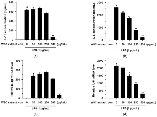 Figure 4. Effects of the WSC extract on LPS-stimulated pro-inflammatory cytokines in RAW264.7 cells. The cells were pretreated with the indicated concentrations of the WSC extract for 3 h and then treated with 1 µg/mL of LPS for 24 h: (a,b) Protein levels of IL-1β and IL-6 were determined by ELISA; (c,d) IL-1β and IL-6 mRNA levels were measured by quantitative real-time PCR. Values are expressed as the mean ± standard deviation of three independent experiments; #, p < 0.05 versus control; *, p < 0.05; **, p < 0.005 versus LPS alone.