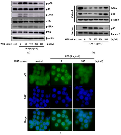 Figure 5. Effect of the WSC extract on MAPK signaling and nuclear translocation of NF-κB in LPS-treated RAW264.7 cells. The cells were pretreated with the indicated concentrations of the WSC extract for 3 h and then treated with 1 µg/mL of LPS for 30 min: (a) The protein levels of total and phosphorylated p38, JNK and ERK were determined via western blotting assays; (b) The protein levels of IκB-α and NF-κB p65 in cytosolic and nuclear fractions were determined via western blotting assays; (c) Localizations of nuclei and NF-κB p65 were visualized following immunofluorescence staining.