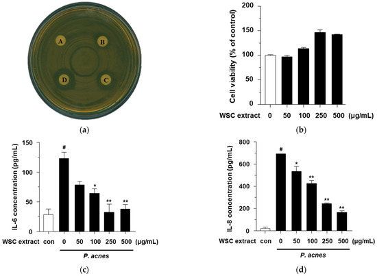 Figure 6. Antibacterial and anti-inflammatory effects of the WSC extract: (a) Antibacterial effects of the WSC extract measured by agar disk diffusion assay (A, DMSO; B, 1 mg/disk of WSC extract; C, 2 mg/disk of WSC extract; D, 3 mg/disc of WSC extract); (b) Cytotoxicity of the WSC extract was measured in HaCaT cells by dimethylthiazol-diphenyltetrazolium bromide assay; (c,d) Secretion levels of IL-6 and IL-8 were determined using an ELISA kit. Values are expressed as the mean ± standard deviation of three independent experiments; #, p < 0.05 versus control; *, p < 0.05; **, p < 0.005 versus LPS alone.
