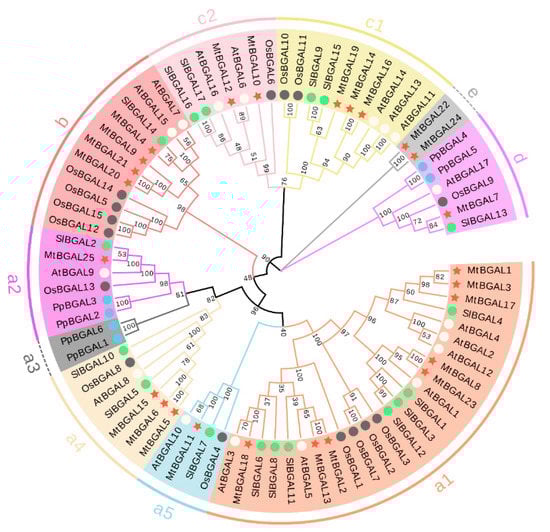 An unrooted phylogenetic tree was constructed with BGALs from A. thaliana, O. sativa, S. lycopersicum and P. persica, and it was found that MtBGALs were presented in all of the BGAL sub-families, except for a bryophyte-specific cluster (a3). In particular, another cluster (e) is species-specific for Medicago with only MtBGAL22 and MtBGAL24 (Figure 1). In addition, all other clusters of a1, a2, a4, a5, b, c1, c2 and d contain members from Medicago, Arabidopsis, rice and tomato.