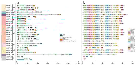Gene structure and architecture of the conserved protein motifs of 25 MtBGAL genes. (a) Sequence structure distribution of MtBGAL genes; blue boxes indicate 5′- and 3′-untranslated regions, while gray boxes and gray lines indicate exons and introns, respectively. The BGAL domain (glyco_hydro_35), GHD, Gal_lectin and N-terminal signal peptide are highlighted with green, purple, orange and red boxes, respectively. Exon–intron structure and conserved domain of MtBGAL genes. Blue boxes indicate 5′- and 3′-untranslated regions; yellow boxes indicate exons; and black lines indicate introns. The BGAL domain (glyco_hydro_1) and N-terminal signal peptide are highlighted by green and red boxes, respectively. (b) Conserved BGAL protein motif composition in Medicago predicted by MEME. Colored boxes indicate different motifs.