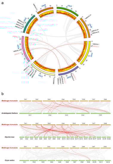 Chromosome distribution and syntenic analysis of BGAL genes in M. truncatula. (a) The chromosomal distribution and interchromosomal relationships of MtBGAL genes. The segmentally duplicated genes are marked in red and connected by red curves. (b) Synteny analysis of BGAL genes between Medicago and three representative plant species (A. thaliana, G. max and O. sativa). Collinear blocks in the background within Medicago and A. thaliana/G. max/O. sativa are shown with gray lines, and the syntenic MtBGAL gene pairs are shown with red lines.