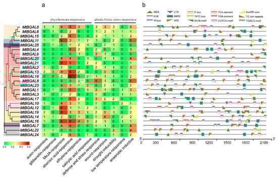 Prediction of cis-acting elements in the promoter region of MtBGALs. (a) The numbers of cis-acting elements detected in the promoter region of each MtBGAL gene, which is presented in the form of a heat map. (b) Colored polygon represented different types of cis-acting elements and their relative location for each MtBGAL gene.