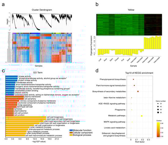WGCNA of co-expression genes. (a) Hierarchical cluster tree showing co-expression modules identified by WGCNA. Each leaf corresponds to an individual gene. The branches correspond to modules of highly interconnected genes. The color rows below the dendrograms indicate different module memberships. (b) Heatmaps showing the expression profile of all the co-expressed genes in the stem-specific module. Each row in the heatmap corresponds to an individual gene. Bar graphs (below the heat maps) indicate the consensus expression pattern of the co-expressed genes within each module. (c) Analysis of enriched GO terms for the gene sets within the stem-specific module. (d) KEGG enrichment analysis of gene sets of the stem-specific module. The larger the circle is, the more genes are enriched in the metabolic pathway, and the more intensive the color is, the more significant the metabolic pathway is.