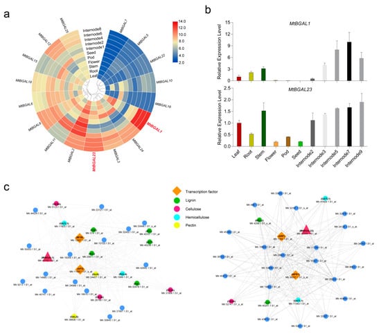 Expression profiles of MtBGAL genes. (a) Expression profiles of MtBGAL genes in six different tissues and five developing internodes from microarray data. (b) Expression analysis of MtBGAL1 and MtBGAL23 in six representative samples and different stem internodes by qPCR analysis. (c) The correlation network of MtBGAL1 and MtBGAL23 in the stem-specific module by using Cytoscape. MtBGAL1 and MtBGAL23 were shown in red triangle, transcription factors were shown in orange rhombus, and enzyme genes in lignin, cellulose, hemicellulose and pectin pathway were presented in blue, red, cyan and yellow, respectively.