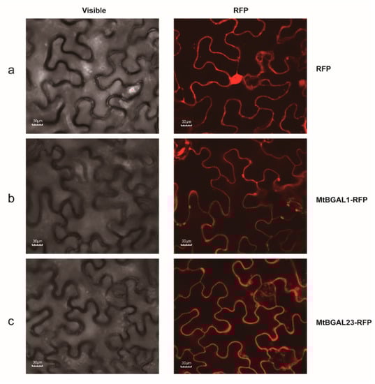 In order to further explore the characteristics of MtBGAL1 and MtBGAL23, we analyzed their subcellular localization by transient expression in N. benthamiana epidermal cells in comparison with the vector control. The cells transformed with vector control with RFP displayed clear red fluorescence signals in the whole cell, in particular in the cytosol (Figure 7a). The cells’ transformed constructs containing MtBGAL1-RFP and MtBGAL23-RFP fusion protein displayed strong red fluorescence signals in the cell wall of the N. benthamiana epidermal cell (Figure 7b,c). Together, these results indicated that both MtBGAL1 and MtBGAL23 are predominantly localized in the cell wall, which is consistent with their tissue-specific expression pattern in the stem.