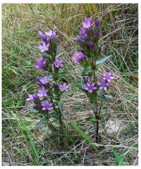 Apart their ornamental value, Gentianella species have been well-known as traditional medicines since ancient times. In South America they have been used as a traditional remedy for the treatment of digestive and liver problems [,]. Gentianella amarella is known in the traditional medicine of Mongolia to cure headache, hepatitis, fever, and gallbladder disorders []. Like other species of the Gentianaceae family, Gentianella plants are characterized by the universal occurrence of three main groups of secondary metabolites, iridoids, flavonoids, and xanthones [].