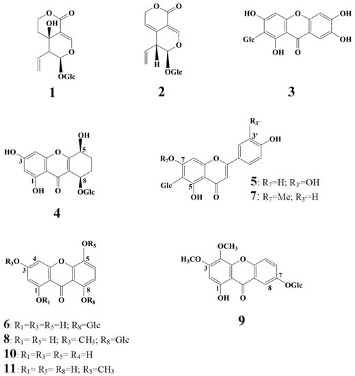Chemical structures of secoiridoid and xanthone compounds identified in G. lutescens. 1—swertiamarin, 2—gentiopicrin, 3—mangiferin, 4—campestroside, 5—isoorientin, 6—demethylbellidifolin-8-O-glucoside, 7—swertisin, 8—bellidifolin-8-O-glucoside, 9—veratriloside, 10—demethylbellidifolin, 11—bellidifolin.