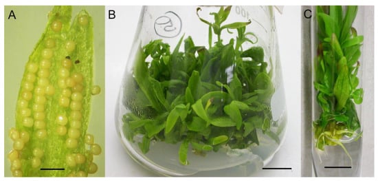 In vitro propagation of G. lutescens. (A) Open pod with immature seeds (bar = 5 mm), (B) shoot multiplication on BM + 0.2 mg L−1 BA (bar = 10 mm), (C) root elongation in PGR-free ½ MS liquid medium after treatment of shoots with 5.0 mg L−1 IBA for 2 days (bar = 10 mm).