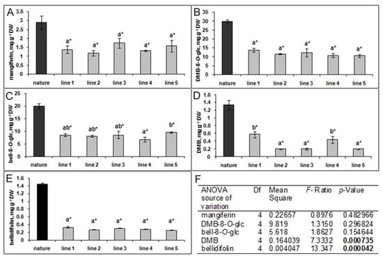 The content of xanthones mangiferin (A), demethylbellidifolin-8-O-glucoside (DMB-8-O-glc) (B), bellidifolin-8-O-glucoside (bell-8-O-glc) (C), demethylbellidifolin (DMB) (D) bellidifolin (E) in five shoot lines of G. lutescens cultured on BM + 0.2 BA mg L−1 for 35 days. Wild G. lutescens herb grown in nature was used as a control. Values are the means ± SE of four to six biological replicates (n = 4–6). Data of xanthones content in shoot lines were analyzed by one-way ANOVA (F). The values followed by different letters were significantly different according to Fisher’s LSD test at p ≤ 0.05; asterisk (*) indicate a significant difference of values between in vitro shoot lines and wild plants samples according to Student’s t-test at p ≤ 0.05.
