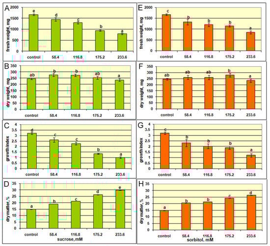 Numerous studies indicated sorbitol as the best carbon source for plant multiplication in many species [,], as well as to distinguish nutritive effect of enhanced sucrose in the growth medium from its osmotic effect. Here, we analyzed the relative impact of increased sorbitol concentrations on G. lutescens shoot cultures. According to ANOVA, increasing concentration of sorbitol significantly altered shoot fresh weight, growth index, dry matter percentage, but not dry weight (Supplementary Material, Table S1).