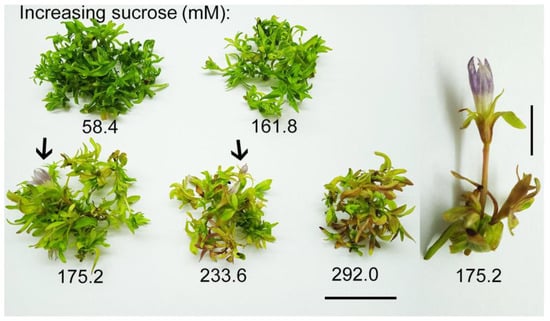 The effect of sucrose at increasing concentrations (58.4, 161.8, 175.2, and 233.6 mM) on the growth and flowering of shoot cultures of G. lutescens (line 5) after 35 days of culture (bar = 20 mm). The increasing concentrations of sucrose were added into control medium (BM + 0.2 mg L−1 BA containing 58.4 mM sucrose). Arrows indicate floral bud development. Right—shoot with normally developed flower regenerated on the medium with 175.2 mM sucrose (bar = 5 mm).
