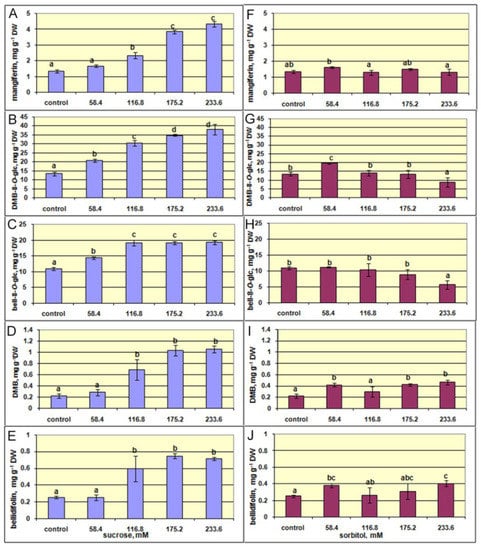 The effect of increasing concentrations (58.4, 161.8, 175.2, and 233.6 mM) of sucrose (A–E) and sorbitol (F–J) on the content of xanthones mangiferin, demethylbellidifolin-8-O-glucoside (DMB-8-O-glc), bellidifolin-8-O-glucoside (bell-8-O-glc), demethylbellidifolin (DMB) and bellidifolin in shoots cultures of G. lutescens (line 5) after 35 days of culture. The increasing concentrations of sucrose or sorbitol were added into control medium (BM + 0.2 mg L−1 BA containing 58.4 mM sucrose). Values are the means ± SE of four to eleven biological replicates (n = 4–11). Values denoted by the same letter are not significantly different according to the Fisher’s LSD test at p ≤ 0.05 following one-way ANOVA.