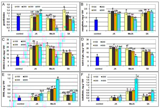 Effect of elicitors jasmonic acid (JA), methyl jasmonat (MeJA) and salicilic acid (SA) at increasing concentrations (100, 200, 300, and 500 µM) on the growth index and xanthone production of shoot cultures of G. lutescens (line 5). Growth index (A), mangiferin (B), DMB-8-O-glc (C), bell-8-O-glc (D), DMB (E), and bellidifolin (F) content. Data represent means ± SE of four to seven biological replicates (n = 4–7). Values denoted by the same letter are not significantly different according to the Fisher’s LSD test at p ≤ 0.05 following ANOVA multifactorial analysis.