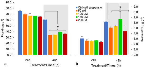 Effects of chitosan (CHI) on piceid (a) and resveratrol content (b) after 24 and 48 h treatments (50–200 μM). Piceid and resveratrol yields are presented as means ± SD of three experiments. * p < 0.05 compared with untreated DJ526 cell suspension (control).