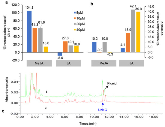 Percentage increase and decrease in piceid (a) and resveratrol content (b) in DJ526 cell suspension after treatment with jasmonic acid (JA) and methyl jasmonate (MeJA) under 5-day elicitation periods (compared with the untreated control). (c) Chromatogram representing an increase in piceid and unknown compound Q content in the 5 day MeJA (5 μM)-treated cell suspension (1) relative to the control (2).