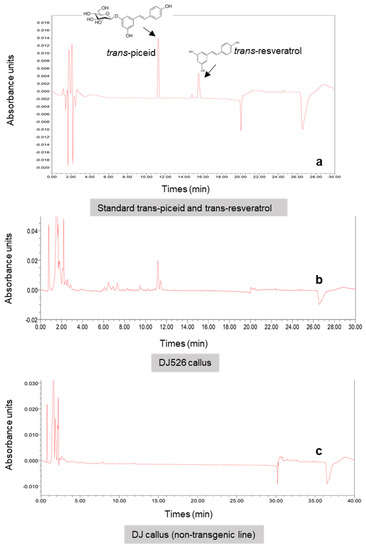 Chromatograms showing the detection of piceid and resveratrol in methanolic extracts of standard (a) and DJ526 rice (b), as well as the lack in non-transgenic rice (DJ) (c).