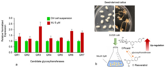 (a) Relative normalized expression of candidate UDP-glycosyltransferase genes after 5 μM MeJA treatment compared with the control group. Expressions are presented as means ± SEM. (b) Schematic representation of in vitro DJ526 cell suspension culture. Calli were induced on 2,4-D supplement media and the suspension culture was treated with 5 µM MeJA, which led to an increase in glycosyltransferase activity.