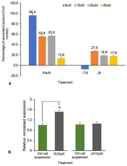 (a) The percentage increase/decrease in total resveratrol production (piceid and resveratrol combined) with methyl jasmonate (MeJA) and jasmonic acid (JA) treatments. (b) RS gene expression of cell suspension treated with MeJA (5 μM) and JA (10 μM) relative to the expression in the control arbitrarily defined as 1. * p < 0.05.