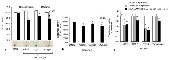 (a) Effects of methyl jasmonate (MeJA)-treated cell suspension extracts on melanin production and viability in melan-a cells. Cells (8 × 104) were treated with 100 mg mL−1 of cell suspension extract and arbutin (positive control) for 3 days. (b) Intracellular tyrosinase activity of 5 μM MeJA-treated and untreated cell suspension. Cell viability, melanin content, and tyrosinase activity are presented as percentages of the control (DMSO). Arbutin was used as a positive control. Data are presented as means ± SD of three independent experiments. * p < 0.05. (c) The expressions of melanogenic related genes, MITF, TRP-1, TRP-2, and tyrosinase, in MeJA-treated cell suspension and DJ526 cell suspension (treatment control).