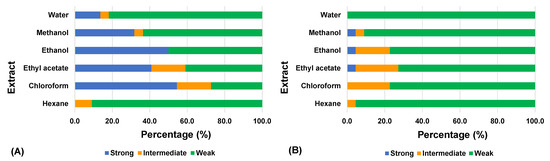 Classification of medicinal plant extracts according to their cytopathic effect inhibitory activity against chikungunya virus in (A) concurrent mode and (B) non-concurrent mode. The number of extracts for each extractant is 22. The inhibitory activity is measured based on the percentage of viable cells protected by an extract from the cytopathic effect caused by the virus. Strong: cell viability ≥70%; intermediate: cell viability 31–69%; weak: cell viability ≤30%.
