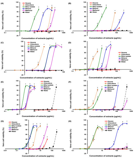 Viability of Vero cells infected by chikungunya virus and treated with different extracts of medicinal plants. (A) Clinacanthus nutans; (B) Diodella sarmentosa; (C) Diplazium esculentum; (D) Ficus deltoidea; (E) Gynura bicolor; (F) Hydrocotyle sibthorpioides; (G) Ocimum americanum; (H) Sechium edule. All plants are shown for the concurrent mode except Ficus deltoidea, which is in the non-concurrent mode. The cell viability is measured using the neutral red uptake assay. The notated asterisks (*) denote significant differences (p < 0.05) among concentrations within an extract by one-way ANOVA.