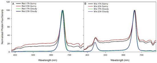 Normalized photon flux density (380–780 nm) from red and mixed LED lighting treatments during both sunny and cloudy days. The spectra were measured using a Li-180 Spectrometer (Li-COR Inc., Lincoln, NE, USA) at a distance of 80 cm from the light fixtures. Measurements for sunny days were done on 11 February 2019 and cloudy days on 14 February 2019 between 12:00 and 14:00. Panel (A) represents spectra from both red light treatments during sunny and cloudy days. Panel (B) represents spectra from both mixed light treatments during sunny and cloudy days.