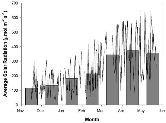 Daily average solar radiation as measured from 16 November 2018 to 22 May 2019 using a Li-COR LI-200R pyranometer converted from W m−2 to µmol m−2 s−1 using the conversion value of 2.1. Readings were taken above the greenhouse and then corrected for an approximate 50% transmissivity to account for shading from the greenhouse structure, lighting fixtures, and shade curtains. Measurements were taken every 2 h, beginning at 08:00 and concluding at 16:00, between the wavelengths of 400 and 1100 nm. Measurements during this period were averaged to provide an average solar radiation for each day (line plot). The bar graph indicates the average daily solar radiation throughout the month. Breaks in the line plot indicate periods of time which were not documented due to a technical malfunction.