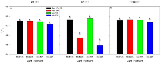 Maximum efficiency of PSII (Fv/Fm) from the 5th leaf of TE tomatoes grown under red 17 h, red 23 h, mix 17 h, or mix 23 h lighting treatments at 23 DIT (8 December 2018, panel A), 62 DIT (January 16, panel B), and 138 DIT (2 April 2019, panel C). Error bars represent the standard error of the mean of n = 8. Letter groups (A, B) represent significant differences between the lighting treatments at a specific time point and leaf position at p < 0.05.