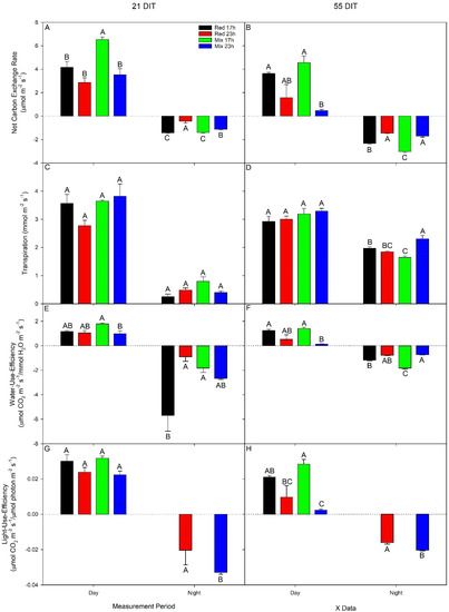 Net carbon exchange rate (NCER; panel A,B), transpiration (panel C,D), water use efficiency (panel E,F), light use efficiency (panel G,H) of the 5th leaf from TE tomato plants grown under either red 17 h, red 23 h, mix 17 h, or mix 23 h lighting treatments at 21 DIT (6 December 2018, panels A,C,E,G) or 55 DIT (9 January 2019, panels B,D,F,H) during the daytime and nighttime. Measurements were performed using a Li-COR 6400 fitted with a clear-top chamber on a cloudy day or night and thus represent the NCER driven mostly by the supplemental lighting. Error bars represent the standard error of the mean of n = 3. Letter groups (A, B, C) represent significant differences within a panel between the lighting treatments at a specific data collection period at p < 0.05.