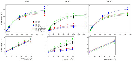 Photosynthetic light response curves from TE leaves grown under either red 17 h, red 23 h, mix 17 h, or mix 23 h lighting treatments at 20 DIT (5 December 2018, panel A), 54 DIT (8 January 2019, panel B), and 134 DIT (29 March 2019, panel C) as determined using a Li-COR 6400 with a red/blue standard Li-COR light source. Measurements were performed at a CO2 concentration of 800µL L−1, leaf temperature of 24 °C, and a relative humidity of 55–65%. Regression lines were fit to y = yo + a(1 − e(−b*x)) for each lighting treatment. Panels (D–F) are magnifications of 0–100 µmol m−2 s−1 PAR regions fit to the regression line y = mx + b.