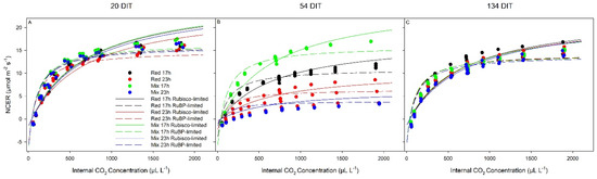 Photosynthetic CO2 response curve from leaves grown under red 17 h, red 23 h, mix 17 h, and mix 23 h lighting treatments at 20 DIT (5 December 2018, panel A), 54 DIT (8 January 2019, panel B), and 134 DIT (29 March 2019, panel C). As determined using a Li-COR 6400 with a red/blue standard Li-COR light source. Measurements were performed at 300 µmol m−2 s−1 PAR, a temperature of 24 °C, and relative humidity of 55–65%. Rubisco- and RuBP-limited fit lines were determined using temperature corrections from [31,32].