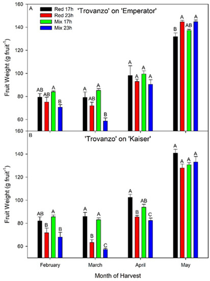 Average fruit weight (size) for cv. ‘Trovanzo’ grafted onto ‘Emperator’ (TE; panel A) or onto ‘Kaiser’ (TK; panel B), grown under red 17 h, red 23 h, mix 17 h, and mix 23 h lighting treatments. Monthly fruit number includes the 1st of each month to the last day of each respective month. Values represent the mean ± the standard error of the mean, where n = 4 for TE and TK. Of note, values representing May yield include a strip harvest on 22 May 2019. Within the month and cultivar, letter groups (A, B, C) represent a statistical difference in fruit weight as determined by a two-way ANOVA with a Tukey–Kramer adjustment (p < 0.05).