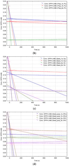 Concentration (DPPH·, mM) versus Time (s) plots for the reaction of DPPH· with antioxidant compounds from unripe and ripe papaya peel extracts (codes Lu and Lr) (a), from the unripe and ripe papaya pulp extracts (codes Pu and Pr) (b), from the unripe and ripe papaya seeds extracts (codes Su and Sr) (c) and from the unripe and ripe papaya seed-pulp extracts (codes SPu and SPr) (d). Determinations were performed as duplicates (excepting Lu and Pr samples). See Supplementary Material File for all results.