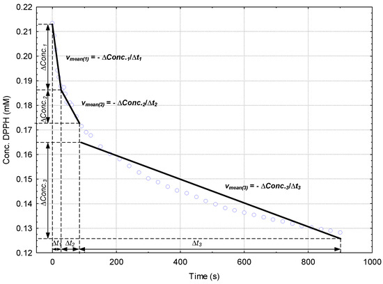 Schematic representation of the calculus of the mean DPPH· reaction rates (vmean(1–3)) from the linear correlations of the Concentration (DPPH·) versus Time plots for the specific time ranges: 0–30 s (Δt1), 30–80 s (Δt2) and 80–900 s (Δt3).