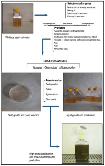 Microalgae cultivations represent an alternative and renewable source to produce biofuels [19,20]. In fact, microalgae produce high levels of lipids, carbohydrates and proteins, which make them a feasible candidate for ecofriendly third-generation biofuels production [11,12]. Unfortunately, the actual costs of microalgal biofuels are still considered higher than conventional fossil oils, therefore, an experimental progress is still necessary to improve and modulate the bio-compounds content. In this context, genetic engineering represents an effective approach in order to obtain a better performance from microalgae [21] (Figure 1).
