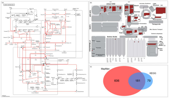 - Thimm, O.; Bläsing, O.; Gibon, Y.; Nagel, A.; Meyer, S.; Krüger, P.; Selbig, J.; Müller, L.A.; Rhee, S.Y.; Stitt, M. MAPMAN: A User-Driven Tool to Display Genomics Data Sets onto Diagrams of Metabolic Pathways and Other Biological Processes. Plant J. 2004, 37, 914–939. [Google Scholar] [CrossRef]
