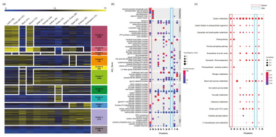 Dissection of the 866 carbohydrate metabolism-related genes using meta-anatomical expression profiles and functional enrichment analysis of 11 anatomical clusters. (a) Using large-scale microarray data, carbohydrate metabolism-related genes were visualized and dissected. The heatmap of the anatomical expression profiles of carbohydrate metabolism-related genes was grouped into 11 clusters via KMC clustering methods. The numbers after the name of each tissue/organ indicate the sample size, and the numbers below each cluster indicate the number of genes in the cluster. (b) GO enrichment analysis of 11 anatomical clusters. The GO enrichment assay revealed the characteristics of each cluster. GO terms were classified according to biological process GO terms. Dot color indicates the fold enrichment value (the blue color is 2, which is the minimum cutoff to select a significant fold enrichment value, and the red color indicates a higher fold enrichment value), and dot size indicates statistical significance (-log10(hyper p-value) is used, and a larger dot size means more significance). (c) KEGG enrichment analysis of 11 anatomical clusters. The enriched KEGG pathway indicated with the dot size represents the ratio of the selected genes to the total genes in the pathway, and the dot color illustrates the adjusted p-value. The numbers below the clusters indicate the number of mapped genes to each pathway. In addition, in GO and KEGG enrichment analyses, the source- and sink-related clusters are highlighted as red and blue boxes, respectively.