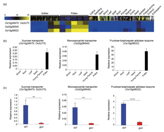 To validate the functional significance of gene clusters according to anatomical expression patterns, three genes (Os10g26740, Os02g06540, and Os10g08022) in cluster H associated with anther and pollen development were selected: sucrose transporter (OsSUT3), monosaccharide transporter, and fructose-bisphosphate aldolase isozyme, respectively. In silico analysis revealed that all these genes showed anther/pollen-preferred expression patterns (Figure 4a). This expression pattern was further confirmed by qRT-PCR, with samples in six tissues/organs (Figure 4b) matching the dissected model. Recently, a defect in the GORI gene changed the distribution of pectin in germinated pollen tubes and eventually led to the male sterile phenotype [35]. Thus, qRT-PCR was performed to analyze their regulatory roles by GORI in the gori mutant. Interestingly, all three genes were significantly downregulated in the gori mutant than in the wild-type (Figure 4c). It was speculated that these transporters and carbon metabolism-related enzymes regulated by GORI might be involved in the pollen tube growth process.