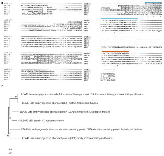 The alignment of the amino acid sequences and phylogenetic relationships between selected proteins and CaLEA73. (a) Amino acid sequences alignment of candidate proteins. They were aligned using the ClustalW program; dashed lines were introduced to maximize sequence alignments. The blue line indicates the first conserved region and the orange line second conserved region. (b).